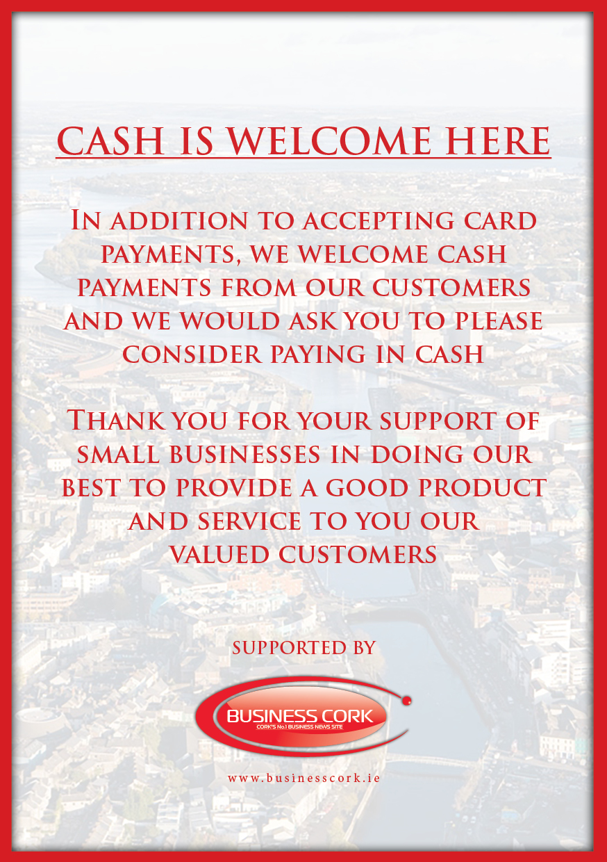 With so much discussion on a ‘Cashless Society’ in the news recently and an appeal from small businesses in every town and village around the country to encourage people to continue using cash so that the banking community will have to provide services for the business sector and citizens, Business Cork has responded to a call for a local sign for any business that wants to display it so as to encourage customers to use cash if they so wish in the business. The sign is FREE for everyone to download and print off and use here #notocashlessonly