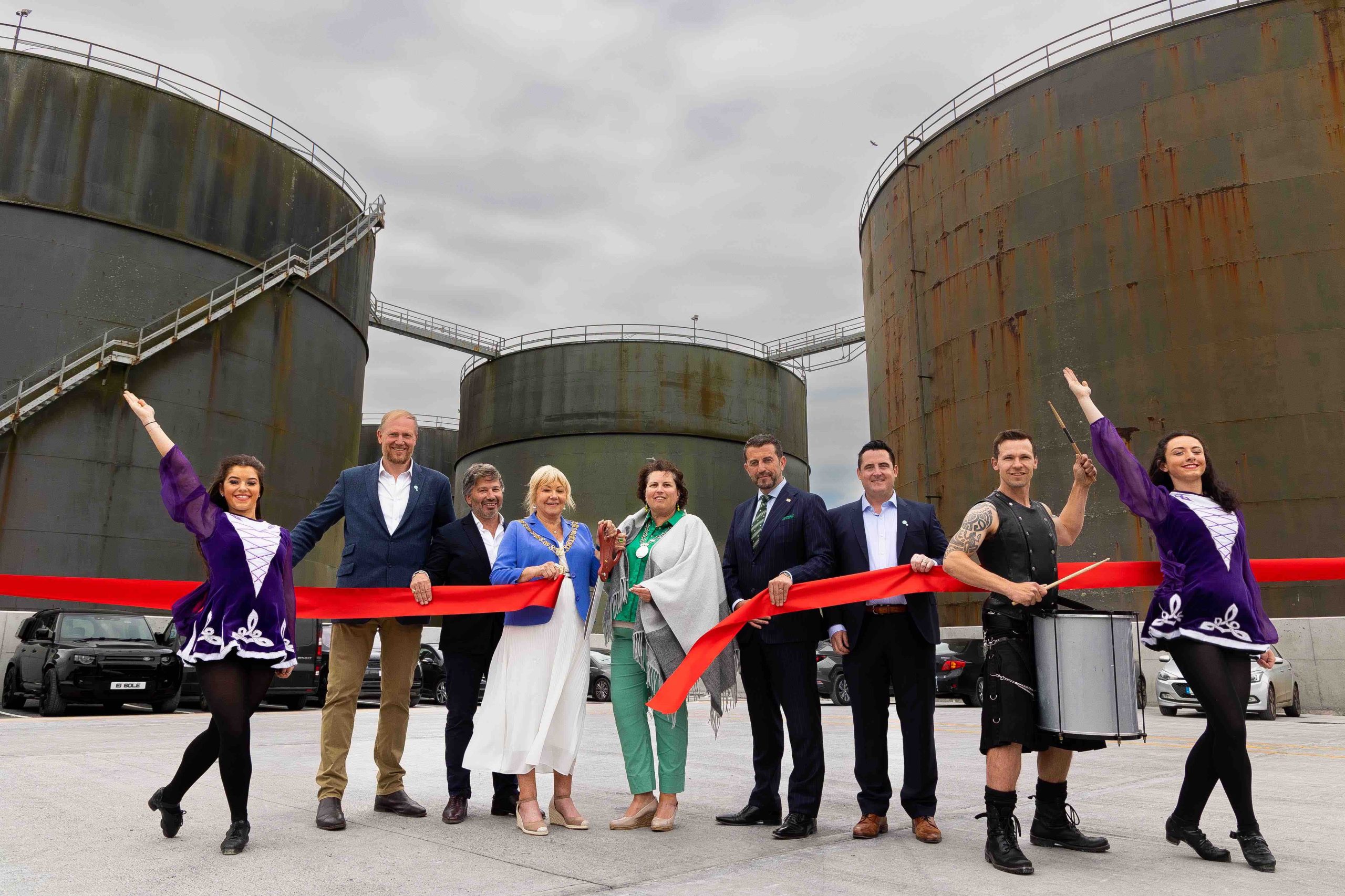 Striving forward: William Tebbit, Chief Executive Officer at GBF; Magnus Hammick, Chief Executive Officer, Green Biofuels Limited UK; Cllr Deirdre Forde, Lord Mayor of Cork; Cllr Audrey Buckley, Deputy Mayor of The County of Cork; Conor Mowlds, Chief Commerical Officer, the Port of Cork Company (PoCC); Peter O’Brien, ROI Manager, GBF Ireland Ltd, pictured today with performers Aoibhin Kenneally (Left), Kevin Curran and Aoibhin Marren (Right), as leading sustainable biofuel supplier GBF officially launched Ireland’s first low-carbon biofuel terminal at Ringaskiddy, Co. Cork. The substantial site, purchased from the Port of Cork Company by GBF in 2022, has undergone a significant redevelopment with an invested capital of approximately €30 million between GBF and partners, leading global energy business BP. The launch signals a significant step forward in Ireland’s energy race and accelerates the transition to NetZero as Gd+ HVO offers a drop-in substitute to diesel to industry across Ireland and the UK, with up to an 85% reduction in emissions.
