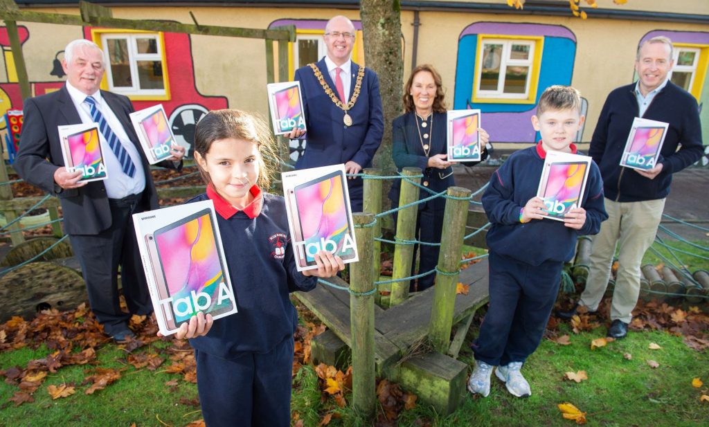 Students Alex Sheehan, Taylor Byrne, Cristiano Hodak , Alannah Bullman with Michael O’Connell Deputy Chairman Gurranabraher Credit Union, Lord Mayor of Cork Cllr Joe Kavanagh , Lady Mayoress Stephanie Kavanagh and Ken Foley Principal Scoil Padre Pio, Gurranabraher Credit Union donates iPads to help literacy and numeracy at Scoil Padre Pio, Churchfield.