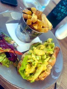 I arrived at lunch time and dropped off my luggage at reception. It is notable that while I was there a bride was dropping off a thank you card to the staff from her wedding the previous weekend. She looked so happy and grateful so I am certain her wedding was magical. I left bags with the amazingly friendly reception crew as I arrived earlier than expected ( i am always early). I then went to The Rockpool (this is their bar and restaurant ) for lunch. I dined indoors and had an incredible coronation chicken croissant. This came with a salad garnish and I ordered a side portion of fries too. The views overlooking Oysterhaven bay are just phenomenal and worth a visit for lunch for this alone. The restaurant itself is spacious and airy and I was glad of the air conditioning while dining as I was there during a very hot spell. At this point I had a diet coke and a coffee too as I just wanted to take on the views on the deck before my treatment.