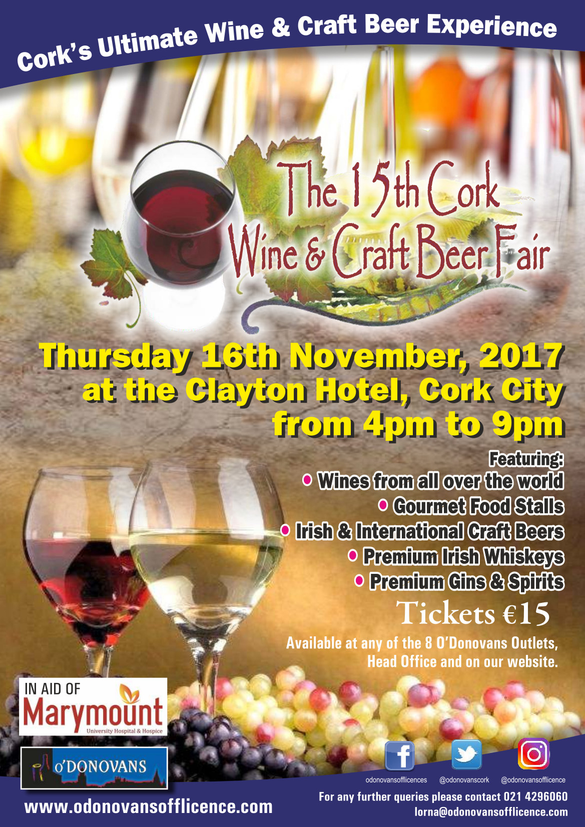 O’Donovans – the Cork Wine Merchants – are proud to announce details of the forthcoming 15th Cork Wine & Craft Beer Fair taking place on Thursday 16th November 2017 from 4-9pm in The Pegasus Suite of The Clayton Hotel, Lapp’s Quay, Cork City. Wines from a worldwide network of suppliers will be showcased in an event spearheaded by a comprehensive wine selection backed up by premium spirits, gourmet foods, craft beers & ciders both Irish and international from our extensive craft beer & cider range in O’Donovans Off Licences.