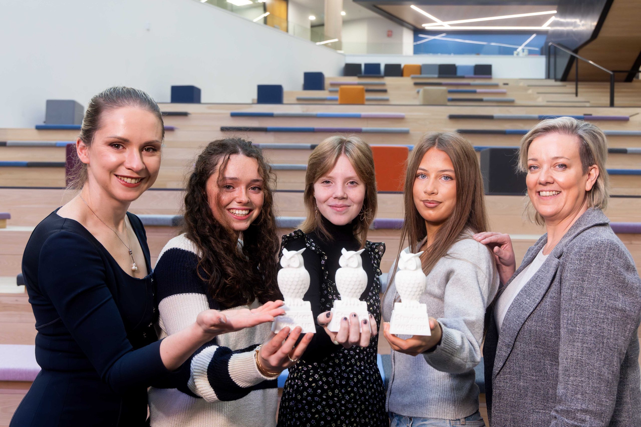 Pictured at the awards prizing giving ceremony at Stryker were Gemma Collins, first prize winner from St. Aloysius College; Abi O’Connor, second prize winner from St. Aloysius College; Aoibhe Sparrow, second prize winner from Mount Mercy College; Mag O’Keeffe, Vice President of Advanced Operations and Global Additive Technologies at Stryker; Kate Kryachko, Stryker Anngrove WISE Leader.